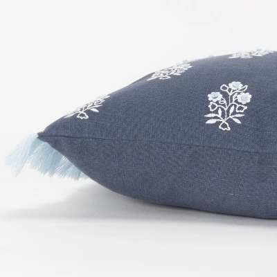This pillow features embroidered floral motifs. Each delicate blossom sports a hand tied French knot center. The ends of this pillow feature a coordinated light blue luxurious eyelash fringe. These delicate blooms would make a delightful addition to any decor where just a spot of softness in form is needed. this pillow features a solid coordinating cotton back with a hidden zipper closure for ease if fill.