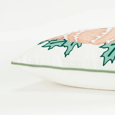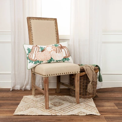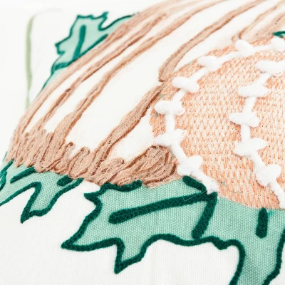 This pillow features a combination of print and accent embroidery. A digital printed base gives dimensional visual texture to the gourds and pumpkins. The hand guided applied chord accents those shapes and colorations. Netted embroidery gives subtle texture and hand guided cord applied gives both dramatic color and texture to this collage. Running stitch embroidery frames the leaves. contrast welted in soft green, this pillow offers a crafted transitional color palette to this traditional harvest theme. The back of this pillow features a solid matching cotton with a hidden zipper closure.
