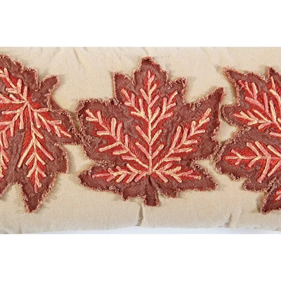 Knife edged; this pillow features an applique oak leaf shape. That leaf has deconstructed frayed edging with over embroidered accents creating the leaf veining. This leaf shape is duplicated as a “falling” leaf pattern sequence across the pillow’s design and gives the pillow soft dimension and medium texturing. A matching solid cotton back features a hidden zipper closure for ease of fill and cleaning.