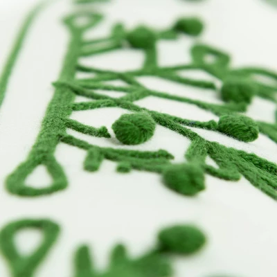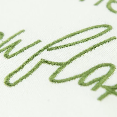 Knife edged, this pillow features a whimsical reminder to take time to chase the snowflakes. This pillow features snowflake shapes framing the top and bottom of the sentiment. Hand tied French Knots provide dimension to the embroidery of the snowflakes. This pillow features a solid matching cotton back with a hidden zipper closure for ease of fill and cleaning.
