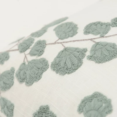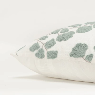 This embroidered pillow features a one color application of hand and machine embroidery stitches. The flower heads are hand embroidered; the tips of those heads are finished with hand guided machine embroidery for that in depth detailing. The stems are machine guided embroidery as well. The application of these flowers across this pillow give this an artisanal appeal and a crafted vibe. the knife edged pillow is at home in universal decors, particularly where crafted, vintage, or farmhouse vibes are celebrated. The back of this pillow is a solid coordinating cotton featuring a hidden zipper closure.