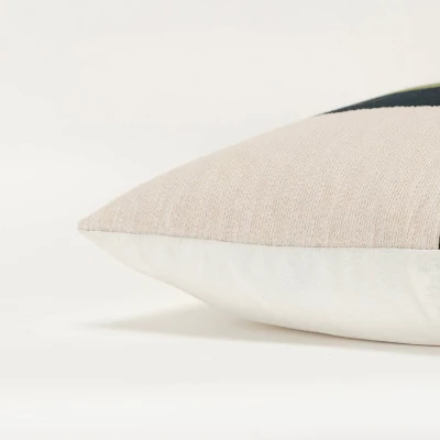 This knife edged pillow features a central symmetrical color block pattern. This pillow is a wonderful addition to any crafted space, any farmhouse or industrially inspired spaces. The color pairings in this pillow are unexpected and resonate with the eclectic blend that brings artistic flair to this pillow. It can be as at home in these mentioned spaces as an artists loft giving it universal design appeal. The back of this pillow is a coordinating solid cotton featuring a hidden zipper closure.