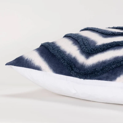 Welcome to textured style elevation in navy and white with this chic accent pillow from Rizzy Home. Elevate any smart decor with this gorgeous, knife-edged 20” X 20” pillow featuring a boho craft chevron-stripe pattern set against a lightly textured cotton slub canvas in ivory with a uniquely incorporated tie-dye element, for an industrial, textured urbane design.