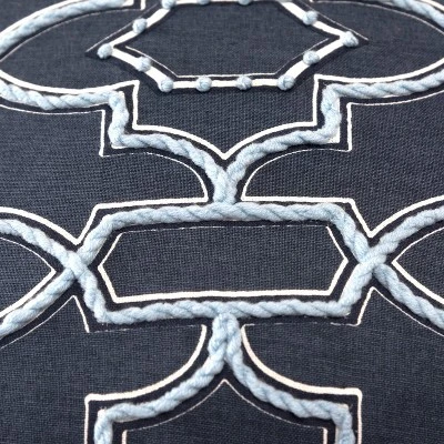 Knife edged, this pillow features a printed tile pattern with accent print in white. Twisted cotton cording is applied using sheer thread to create dimension both visually and literally. Hand tied French knots complete the handcrafted appeal of this pillow. This pillow would be at home alone as a crafted statement or layered. This pillow features a solid coordinating cotton back with a hidden zipper closure for ease of fill.