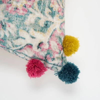 Bring an eclectic blend of comfort and style to your home décor with the Rizzy Home 20″ x 20″ soft cotton and viscose blend velvet pillow. Boasting an eye-catching mix of modern urban farmhouse and boho chic style, this pillow features an intricate medallion pattern in shades of teal, yellow, pink, navy, and light blue that give it a beautiful vintage flair. Triple pom pom embellishments in each corner and a soft, light sheen provide just the right amount of fun, whimsical character to your living space.