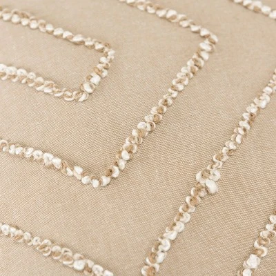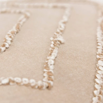This knife edged pillow features applied cording in ivory and natural that offers a wonderful contrast to the natural solid background fabric. This cording is twisted and slightly kinked in the stitching process and secured using a sheer thread. Your family can LIVE on this pillow without worry of this cording becoming detached or giving way. This thing of beauty is structured to withstand hearty family living. The back of this pillow is a solid coordinating cotton back with a hidden zipper closure for ease of fill.