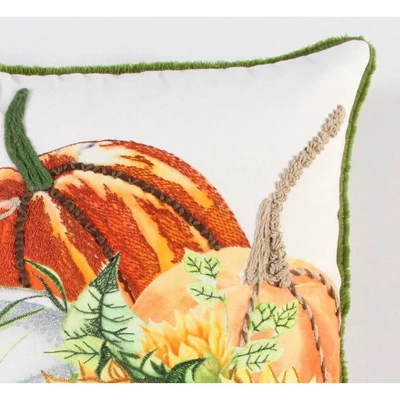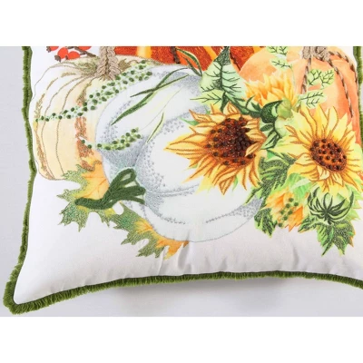Energized with beautifully bright colors and artisanal stitching techniques, this pillow is a wonderfully energized addition to any fall décor. Machine and hand embroidery accent the digitally printed pillow. Hand tied French knots accentuate the white and yellow pumpkin vining. Sunflowers spell the end of summer and the transition to fall. Green contrasting eyelash fringe frames this pillow. a solid matching back with hidden zipper closure makes filling and cleaning this pillow a breeze.