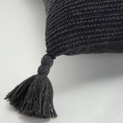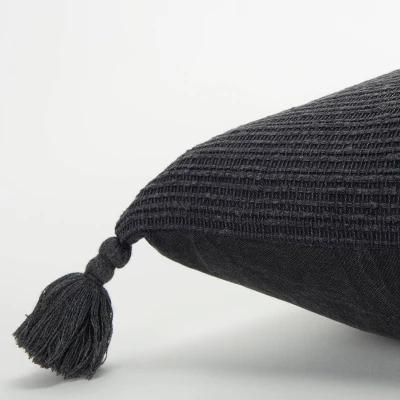 Knife edged, this pillow features a woven, medium textured ribbed face. One hundred percent cotton, this pillow has an artisinal appeal demonstrated in the technique of the weaving and the organically crafted appeal. Four corner tassels add pomp and personality to this fun solid. This pillow features a coordinating cotton back with a hidden zipper closure for ease of fill and cleaning.