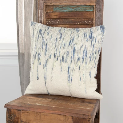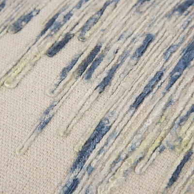 Fine reclaimed sari yarn has been hand-selected and hand-spun to create the icicle pattern on this Rizzy Home Neutral Ivory and Blue Square Abstract Throw Pillow — providing uniqueness to each pillow. This piece is crafted with 80 percent jute and 20 percent cotton fiber with a hidden zipper and polyester fill — completed with a knife edge; this pillow is made to bring lasting beauty to your home décor.