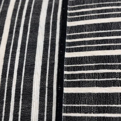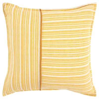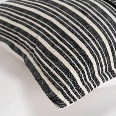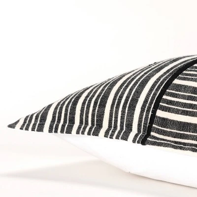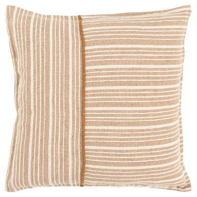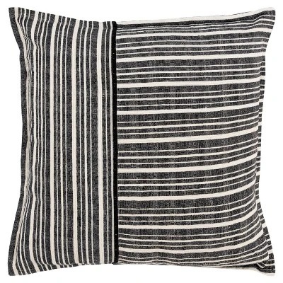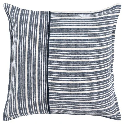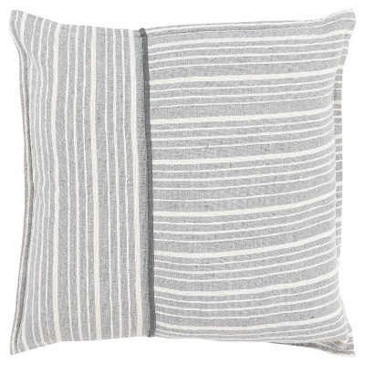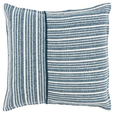 This pattern-blocked pillow features a woven stripe with oh so delightful a light texture. Different widths of stripes woven in white give this pillow a sophistocated transitional appeal. The pattern takes a quarter of a turn and is joined by a full vertical row of satin stitch embroidery in the solid of the base color. A half inch stitched flange frames this simple statement pillow. The back is a coordinating solid cotton with a hidden zipper closure, making fill insertion and removal a breeze.