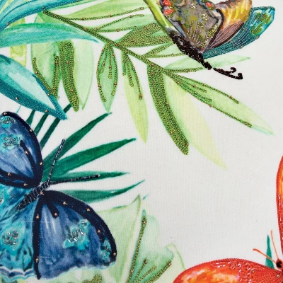 The Rizzy Home 20″ x 20″ digital print and embroidery accent pillow is a striking statement piece that anchors any room, infusing it with the beauty of nature. With its tropically inspired design, intricate hand-guided embroidery, and delicate hand-beaded embellishments, this pillow adds dimension and whimsical motion, creating a captivating and enchanting atmosphere.