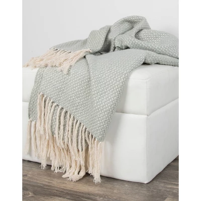 Wrap yourself up in this luxuriously soft Rizzy Home Light Mint Green and Ivory Hand-tied Fringe Reversible Throw Blanket. This piece is made from 100-percent cotton yarn that is brushed for softness, woven to create a dotted effect with the green framing the ivory and finished with a long, hand-tied, ivory fringe. This throw is sure to be claimed by the first person to cuddle under it.