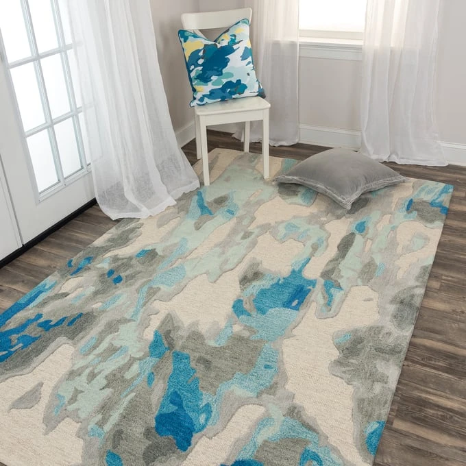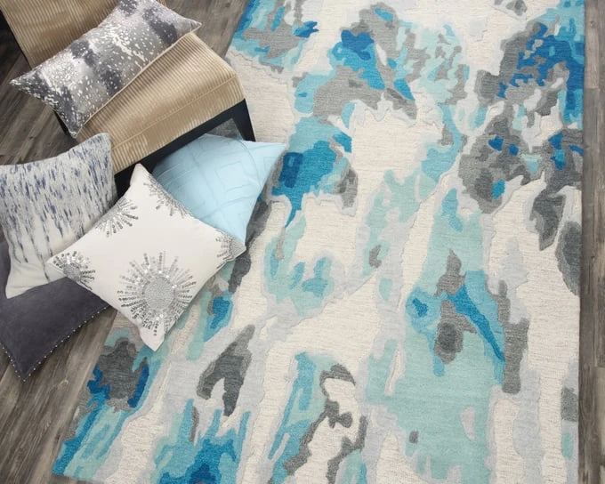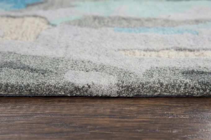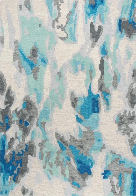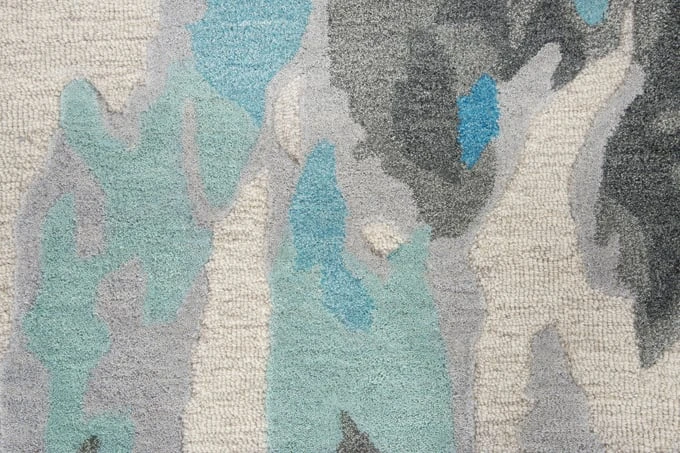 This unique design is hand tufted with a mixture of fine loop and cut pile wool that is then hand trimmed to emphasize the texture and add depth. The blended shades of Blues, Turquoise, Ivory and Gray meld together to produce a look that is exciting yet has a tranquil feel.