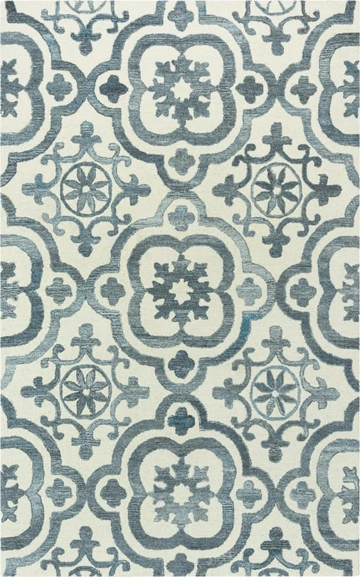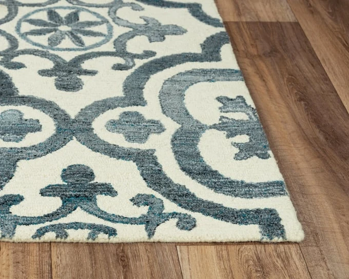 This beautiful scroll design is timeless and versitile enough to go in most any direction from Maodern to Classic. The plush, soft Ivory wool back ground is accented perfecty by recycled Polyester yarns dyed in mutli shades of Blue.
